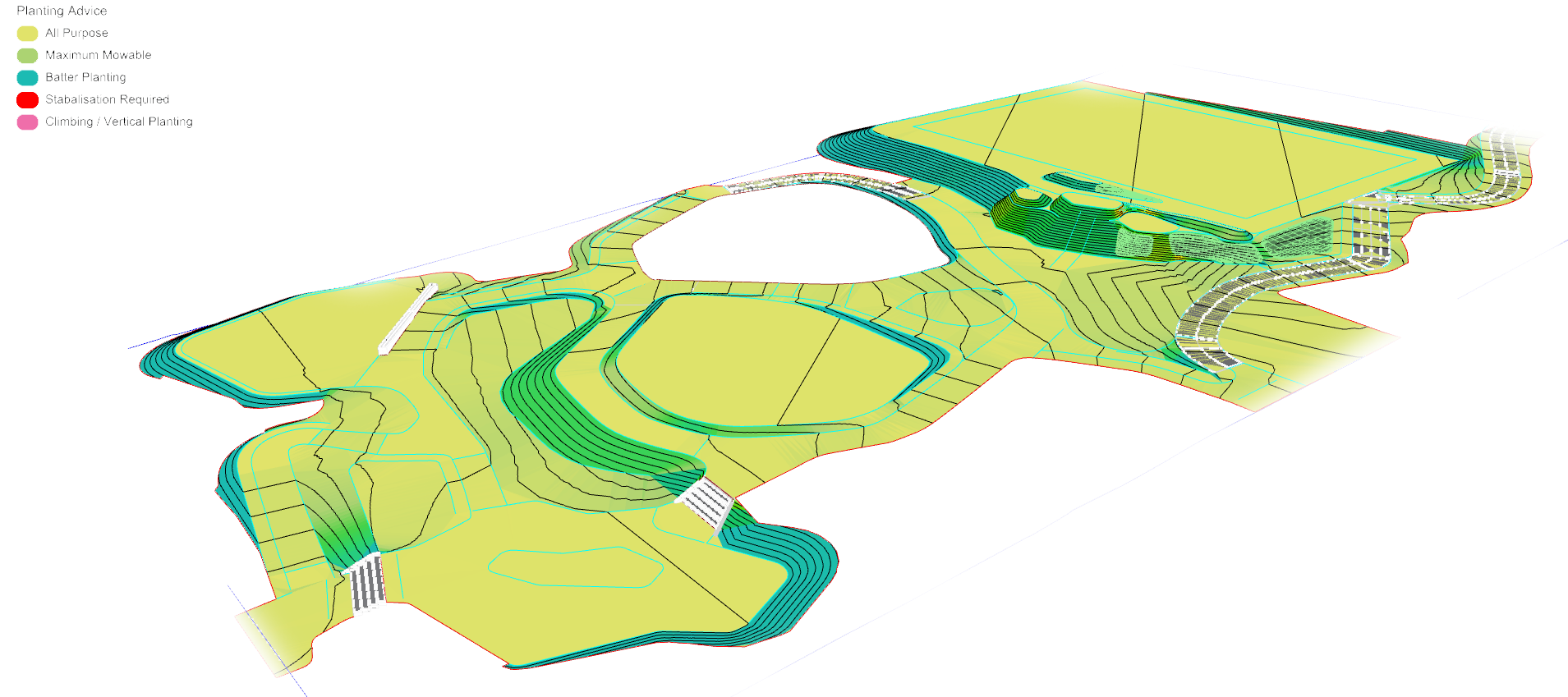 Display modes to instantly review surface grades for planting, drainage and accessibility.